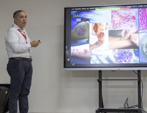 Como segundo punto, se da paso a la presentación de casos clínicos. En primer lugar el Dr. Bryan Salvador Sol Tlapalamatl, del departamento de Dermatología, presenta el caso clínico de Liquen plano ungueal; una propuesta terapéutica. En los comentarios, el Dr. Quiñones comenta que la aplicación de esteroide de alta potencia tópico y oclusivo da buenos resultados y se resalta el tratamiento adicional con hidroxicloroquina vía oral. A continuación, la Dra. Raquel Guadalupe Rojas Castañeda, del departamento de dermatología pediátrica presenta el caso de Pénfigo Seborreico en pediatría, en los comentarios, se recuerda que los corticoesteroides sistémicos son el tratamiento de elección y el tratamiento como el Rituximab son seguros y eficaces, además se puntualiza la importancia de la biopsia en los dos casos presentados hasta el momento. En  tercer lugar, el Maestro en Ciencias Jorge Arturo Mayorga Rodríguez presenta el caso de Esporotricosis trasmitida por arañazo de gato, reporte de casos en México, al término, se comenta que el tratamiento en estos casos para el paciente y para los gatos en cuestión, es itraconazol. Así como mencionar que Jalisco es un estado endémico de Esporotricosis.  En cuarto lugar, el  doctor Alfredo Soto Ortiz, del departamento de cirugía dermatológica, presenta Opciones de reconstrucción facial en cáncer cutáneo. Al finalizar se felicita al doctor Soto por los excelentes resultados quirúrgicos.