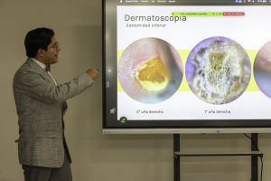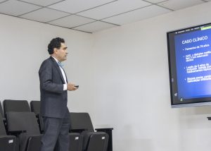 Como segundo punto, se da paso a la presentación de casos clínicos. En primer lugar el Dr. Bryan Salvador Sol Tlapalamatl, del departamento de Dermatología, presenta el caso clínico de Liquen plano ungueal; una propuesta terapéutica. En los comentarios, el Dr. Quiñones comenta que la aplicación de esteroide de alta potencia tópico y oclusivo da buenos resultados y se resalta el tratamiento adicional con hidroxicloroquina vía oral. A continuación, la Dra. Raquel Guadalupe Rojas Castañeda, del departamento de dermatología pediátrica presenta el caso de Pénfigo Seborreico en pediatría, en los comentarios, se recuerda que los corticoesteroides sistémicos son el tratamiento de elección y el tratamiento como el Rituximab son seguros y eficaces, además se puntualiza la importancia de la biopsia en los dos casos presentados hasta el momento. En  tercer lugar, el Maestro en Ciencias Jorge Arturo Mayorga Rodríguez presenta el caso de Esporotricosis trasmitida por arañazo de gato, reporte de casos en México, al término, se comenta que el tratamiento en estos casos para el paciente y para los gatos en cuestión, es itraconazol. Así como mencionar que Jalisco es un estado endémico de Esporotricosis.  En cuarto lugar, el  doctor Alfredo Soto Ortiz, del departamento de cirugía dermatológica, presenta Opciones de reconstrucción facial en cáncer cutáneo. Al finalizar se felicita al doctor Soto por los excelentes resultados quirúrgicos.