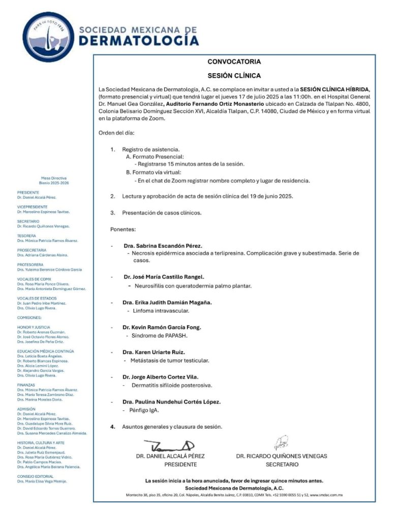 El 21 de agosto de 2025 se llevó a cabo la Sesión Clínica de la SMD en el Centro Dermatológico D...