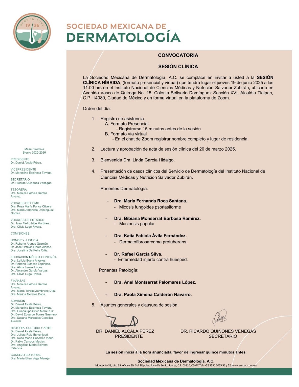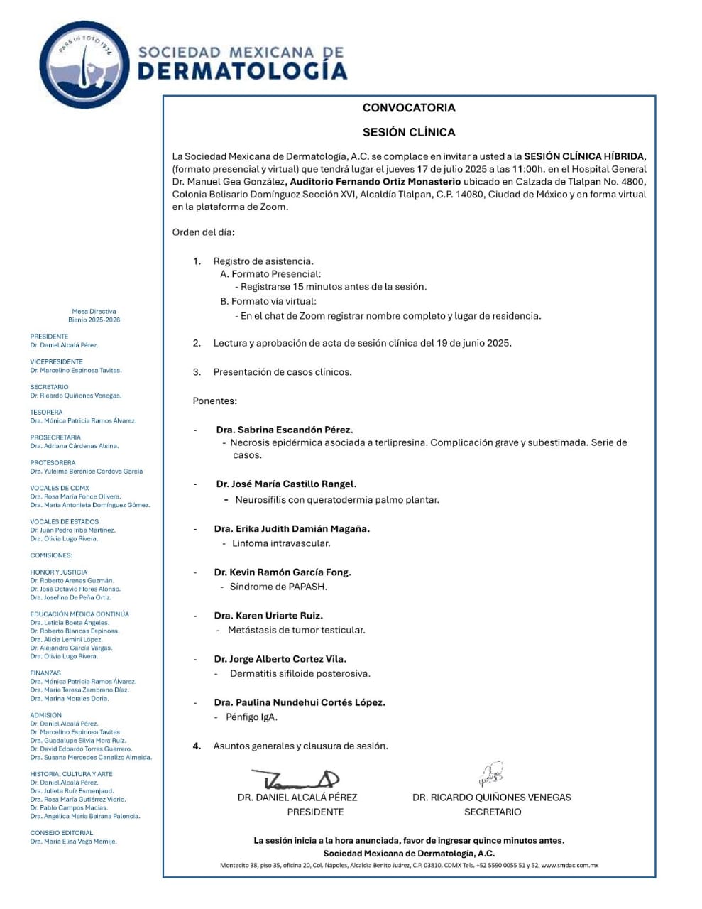 Acta de la Sesión Clínica del 17 de julio del 2025 de la SMD El Dr. Alcalá inicia dando la bienvenida a los asistentes presentes y virtuales, y agradece al servicio de Dermatología del Hospital General Dr. Manuel Gea González por permitir que se lleve a cabo la sesión de la Sociedad en dicho espacio. […]